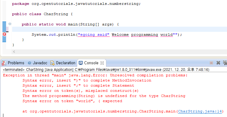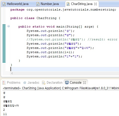 //System.out.println('생활코딩'); //result: error