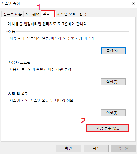 3. 시스템 속성 → 고급 탭 → 환경 변수 선택