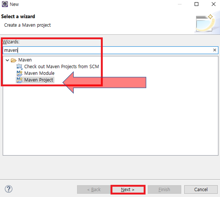 2. [Select a wizard] Wizards 검색창에 maven 입력 → Maven Project 선택 후 Next >