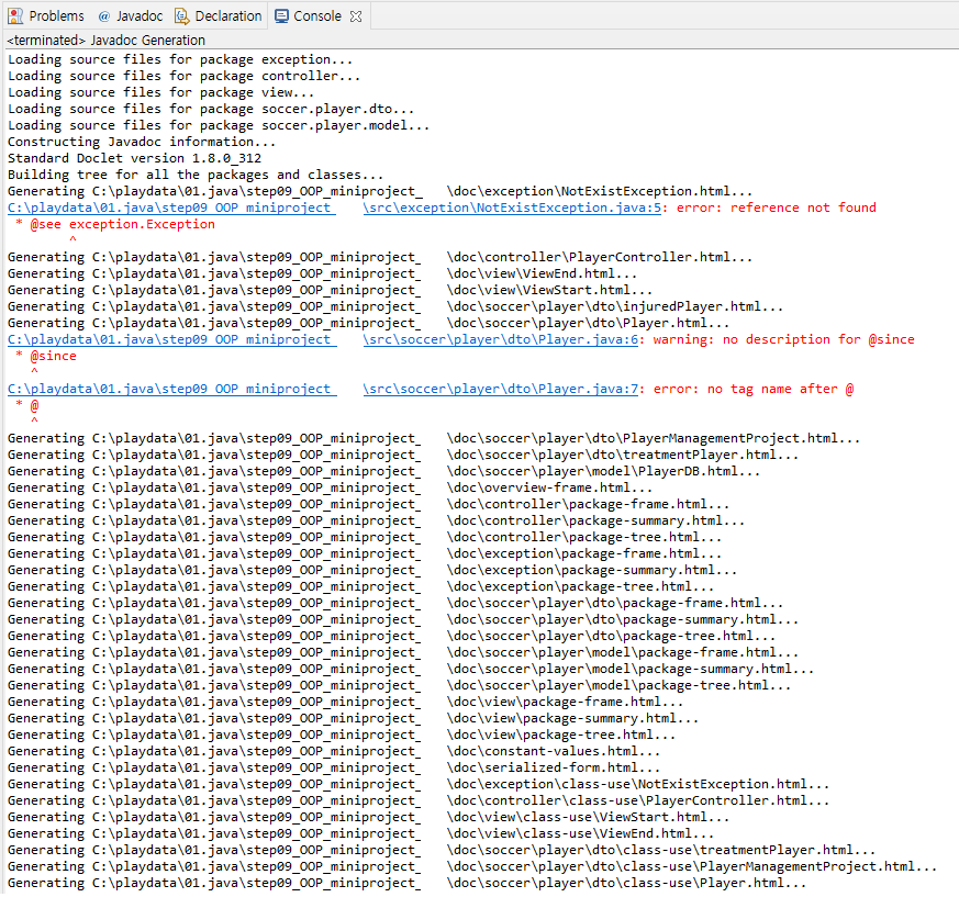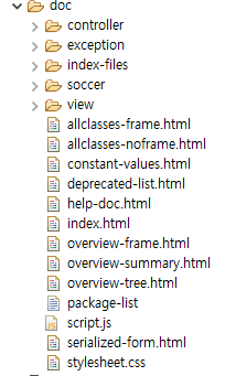 - 에러는 뭔가 뜨지만 javadoc 폴더에 파일들이 정상적으로 생성됨을 확인할 수 있다.