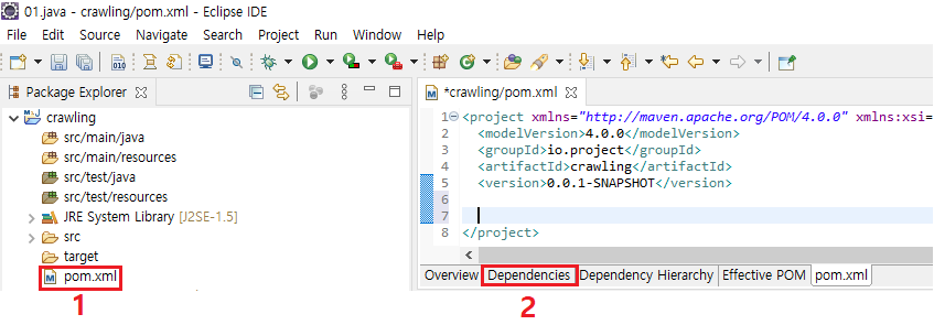 1. Maven Project를 생성 → pom.xml 파일 실행 → 하단에 pom.xml 탭 → Dependencies 탭 마우스로 클릭