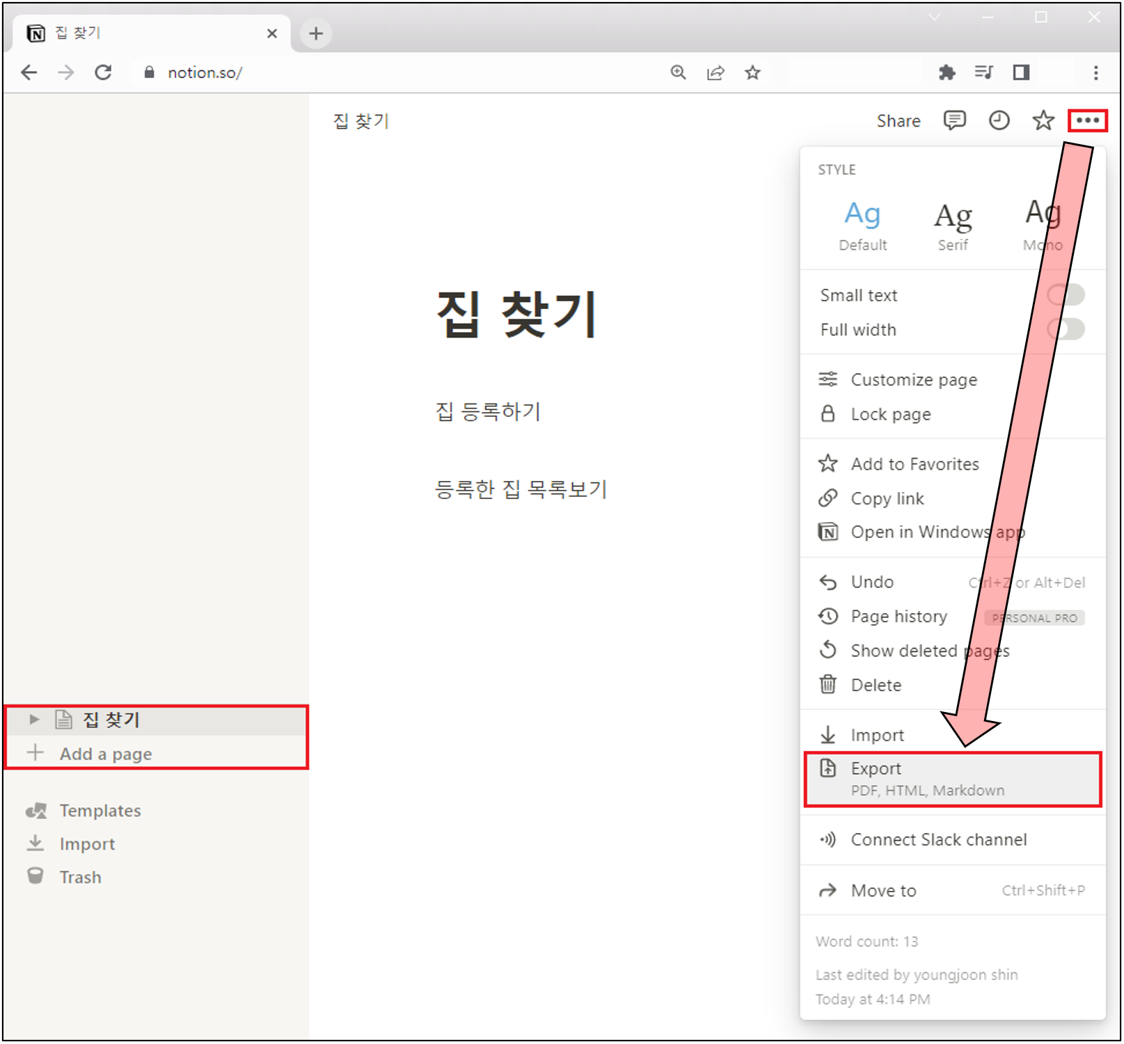 2. 새 페이지 생성 후 html 포맷 입력 → 우측 상단 ... 클릭 → Export 클릭
