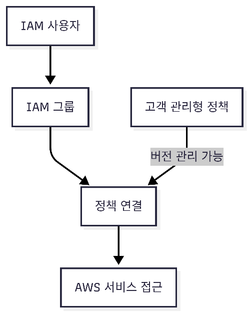 flowchart TD U[IAM 사용자] --> G[IAM 그룹] G --> P[정책 연결] P --> AWS[AWS 서비스 접근] CM[고객 관리형 정책] -->|버전 관리 가능| P
