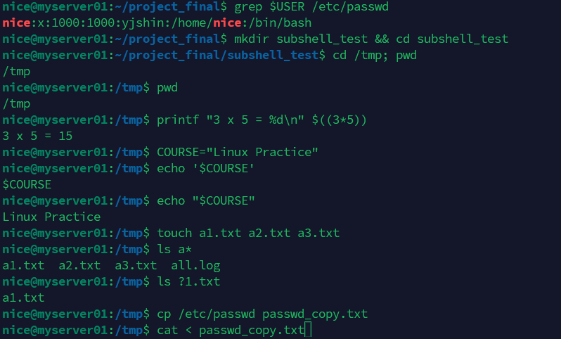 - subshell_test 디렉토리를 만들고 그 안으로 이동한 뒤, ( cd /tmp; pwd ) 를 실행하고 다시 pwd 를 실행했을 때 결과 차이를 확인하세요.