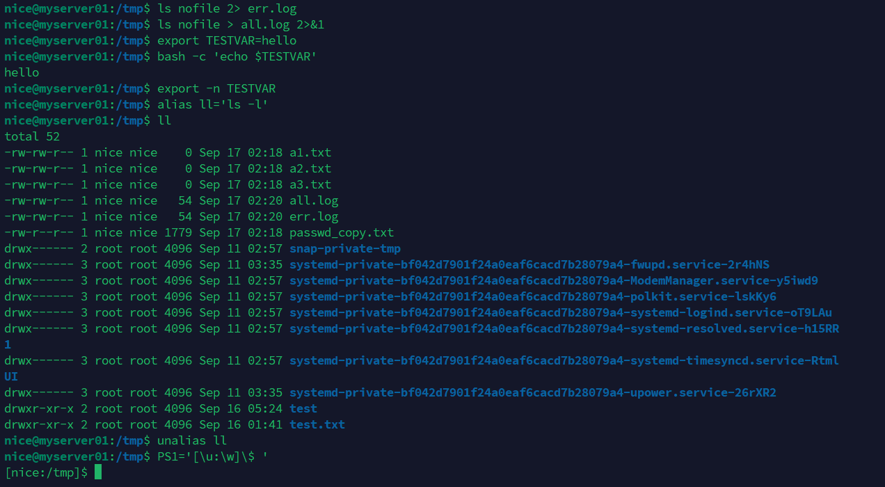 - alias ll='ls -l' 을 설정하고 실행해 본 뒤, unalias ll 로 해제하세요.