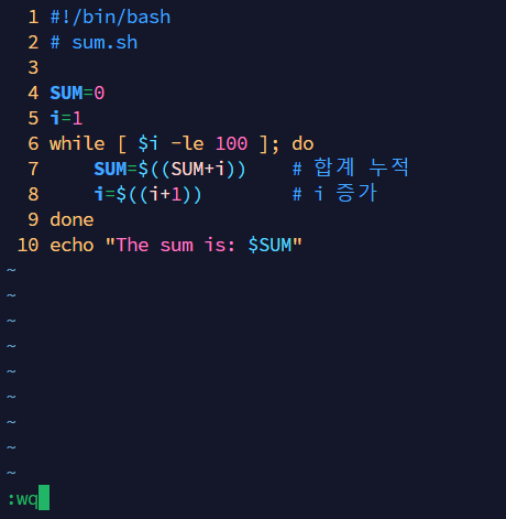 - 1부터 100까지 합을 계산하고 "The sum is: 5050" 형태로 출력한다.