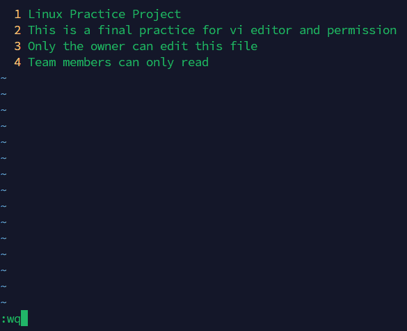 Linux Practice Project This is a final practice for vi editor and permission Only the owner can edit this file Team members can only read
