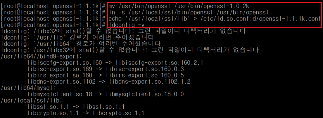 # echo '/usr/local/ssl/lib' > /etc/ld.so.conf.d/openssl-1.1.1k.conf