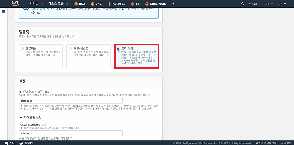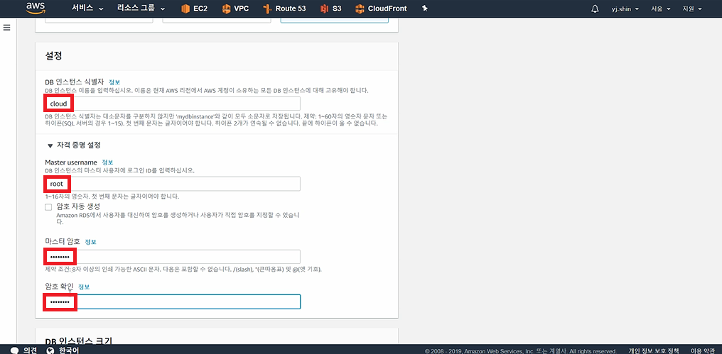 설정  - DB 인스터스 식별자 / - 로그인 ID & PW 입력