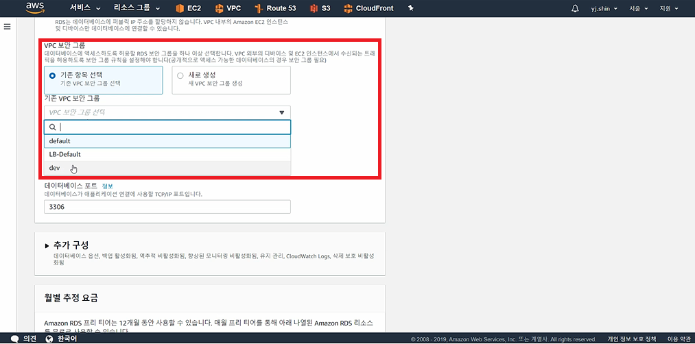 기존 VPC 보안 그룹 - default -> dev로 설정