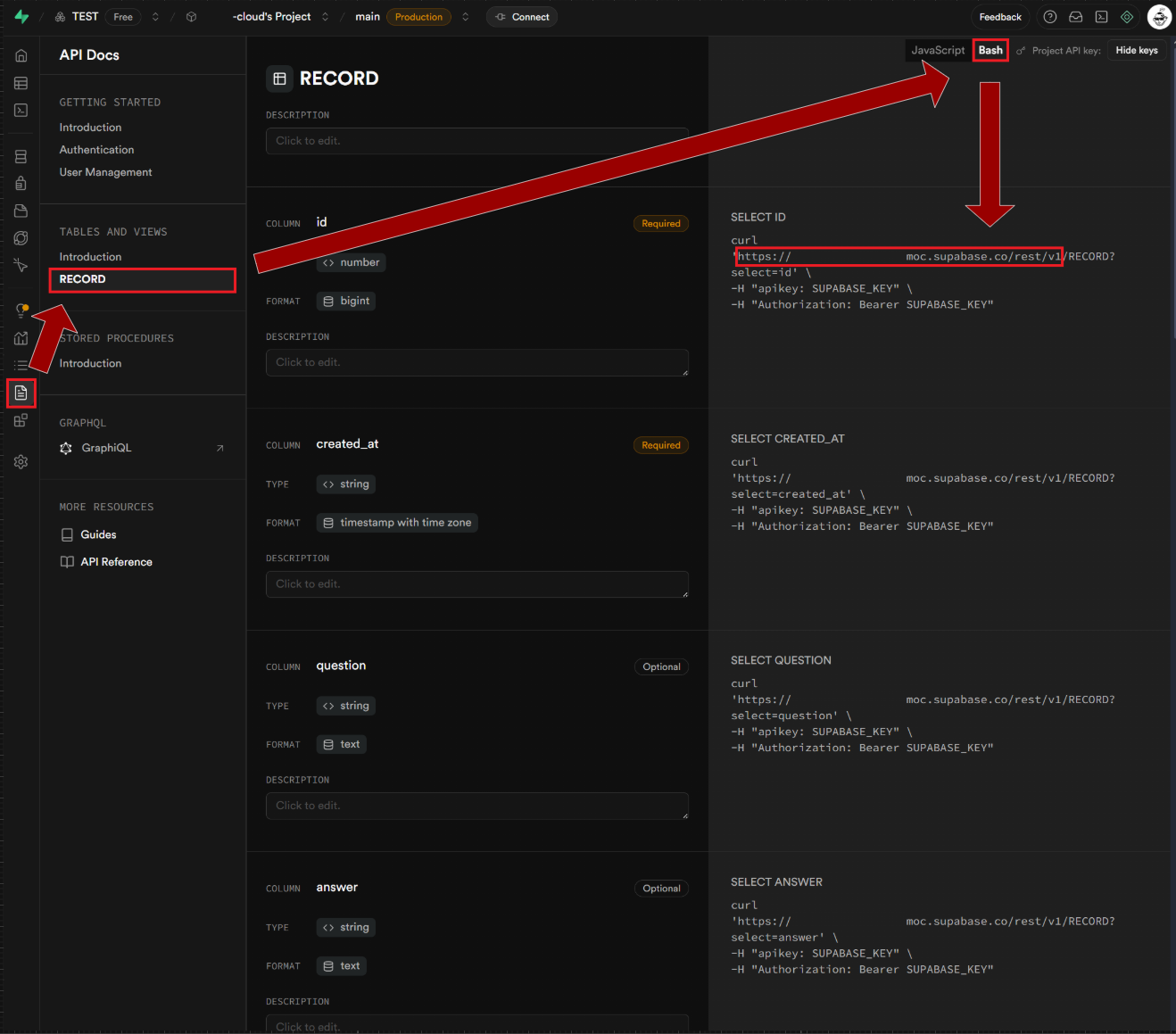 Supabase -> MyProject -> API Docs -> TABLE NAME -> Bash -> Link Copy