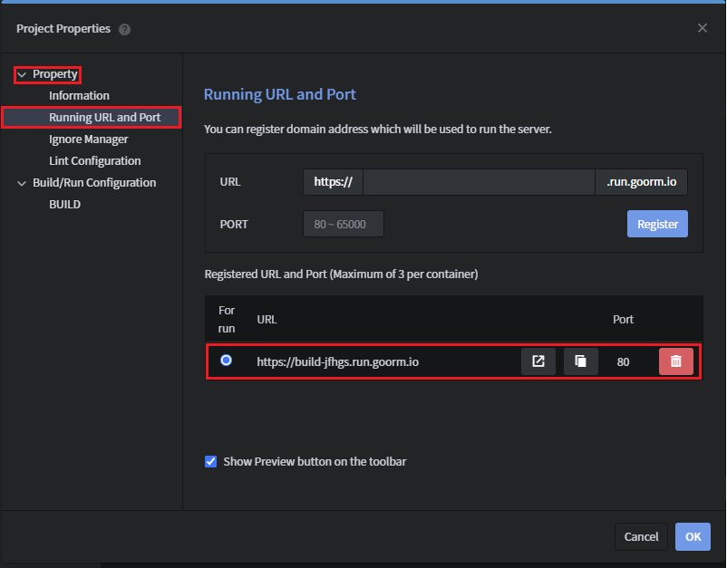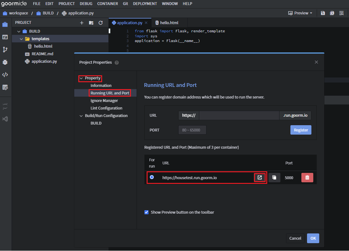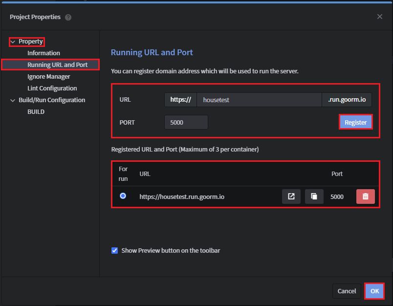 4. PROJECT → Running URL and Port