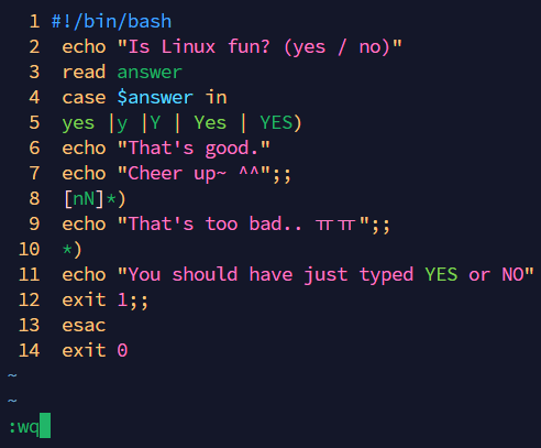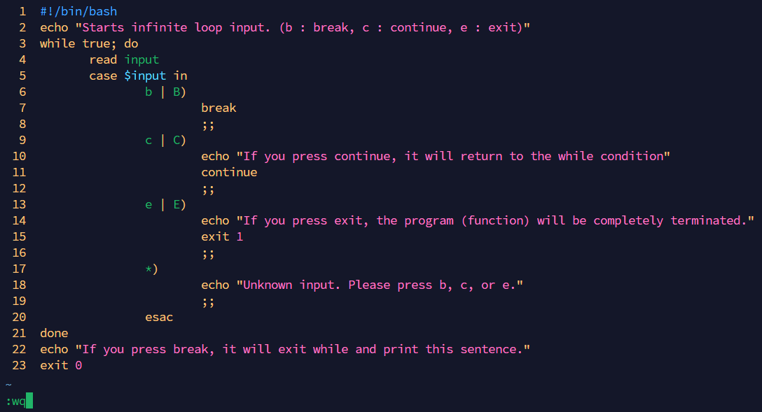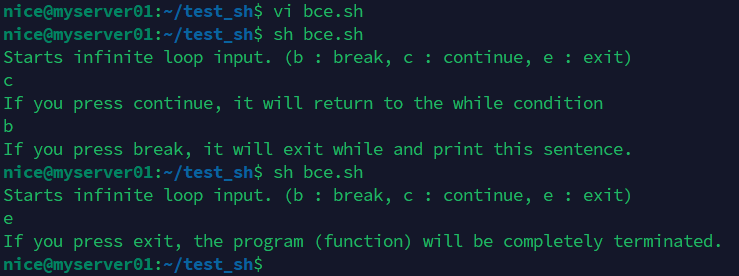 echo "Starts infinite loop input. (b : break, c : continue, e : exit)"
